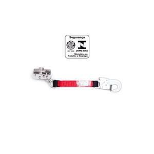 Trava queda para corda de Ø 12 mm em aço inox, com extensor em fita de poliéster 20 cm. Conector classe T em aço com trava automática, abertura de 20 mm. Dispositivo de bloqueio em aço inox com trava de segurança para posicionamento.